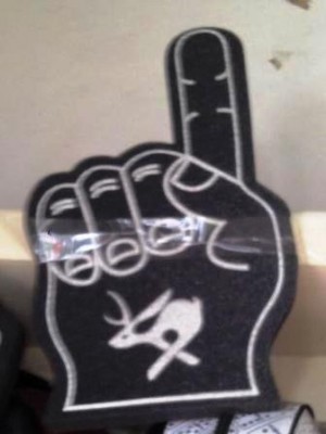 manos gigantes hechas en fomi con logos