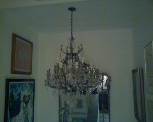 El candil es de cristal checoslovaco, de bronce, los brazos están cubiertos de cristal. Mide 1.25 de alto por 90 cms. de ancho.
